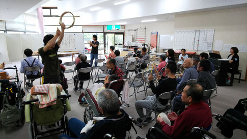 専門の講師によりスタートした音楽療法を、職員による音楽レクとして継続して行っています。音楽の持つリラックス作用や、コミュニケーションを引き出す力を利用して、心身の健康の回復や向上を目的に行っています。